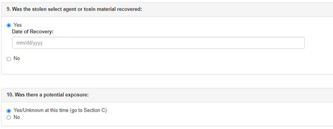 Note: Thefts and Losses must be reported even if the select agent or toxin is subsequently recovered or the responsible parties are identified.