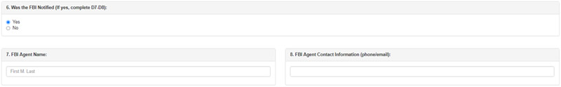 - Complete question 6image icon. If Yes, complete questions 7-8 for the FBI Agent contacted.